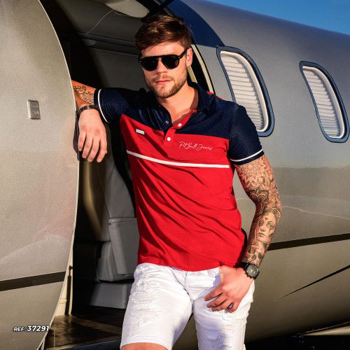 Gola polo manga curta, em malha viscose com elastano e recorte a malha de leve brilho azul marinho. Metais em branco e assinatura pitbull.